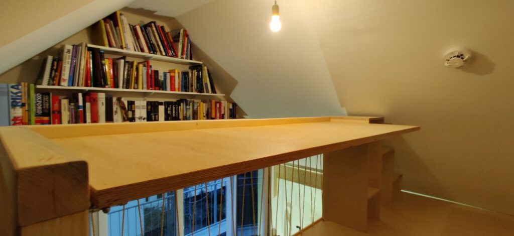 Floating work space with a railing made of sisal ropes. The stairs can be parted to ensure child safety and to safe space if needed. The collapsible desk allows the use of the plane as spare bed.